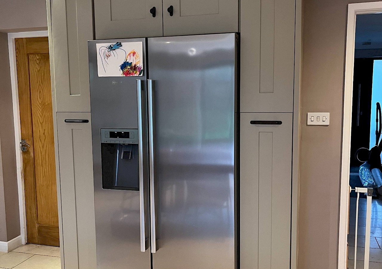 A complete transformation of a shaker style kitchen using Zoffany Double Harbour Grey paint. The kitchen was updated with Corston Kilburn bronze pull handles and knobs.